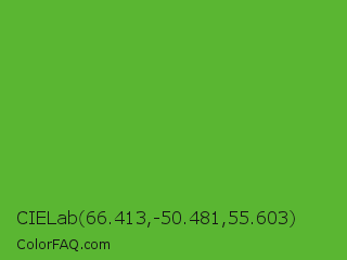 CIELab 66.413,-50.481,55.603 Color is a normal green color and the nearest color is Green RYB #66b032. Hex code #5ab632 and RGB value is rgb(90,182,50). In RGB color space, this color is composed of 35% red, 71% green, 20% blue, In CMYK color space, this color is composed of 51% cyan, 0% magenta, 73% yellow , 29% black , In HSL color space, this color has a hue angle of 102° , 57% saturation and 45% lightness.