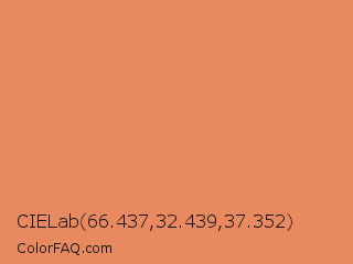CIELab 66.437,32.439,37.352 Color is a light orange color and the nearest color is Big Foot Feet #e88e5a. Hex code #e88960 and RGB value is rgb(232,137,96). In RGB color space, this color is composed of 91% red, 54% green, 38% blue, In CMYK color space, this color is composed of 0% cyan, 41% magenta, 59% yellow , 9% black , In HSL color space, this color has a hue angle of 18° , 75% saturation and 64% lightness.