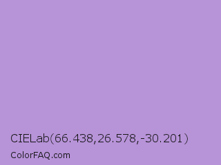 CIELab 66.438,26.578,-30.201 Color is a light purple color and the nearest color is Light Pastel Purple #b19cd9. Hex code #b793d8 and RGB value is rgb(183,147,216). In RGB color space, this color is composed of 72% red, 58% green, 85% blue, In CMYK color space, this color is composed of 15% cyan, 32% magenta, 0% yellow , 15% black , In HSL color space, this color has a hue angle of 271° , 47% saturation and 71% lightness.