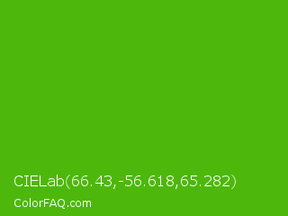 CIELab 66.43,-56.618,65.282 Color is a normal green color and the nearest color is Kelly Green #4cbb17. Hex code #4db80b and RGB value is rgb(77,184,11). In RGB color space, this color is composed of 30% red, 72% green, 4% blue, In CMYK color space, this color is composed of 58% cyan, 0% magenta, 94% yellow , 28% black , In HSL color space, this color has a hue angle of 97° , 89% saturation and 38% lightness.
