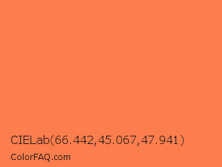 CIELab 66.442,45.067,47.941 Color is a light orange color and the nearest color is Coral #ff7f50. Hex code #fc7d4d and RGB value is rgb(252,125,77). In RGB color space, this color is composed of 99% red, 49% green, 30% blue, In CMYK color space, this color is composed of 0% cyan, 50% magenta, 69% yellow , 1% black , In HSL color space, this color has a hue angle of 16° , 97% saturation and 65% lightness.