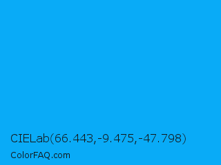 CIELab 66.443,-9.475,-47.798 Color is a normal blue color and the nearest color is Vivid Cerulean #00aaee. Hex code #09abf7 and RGB value is rgb(9,171,247). In RGB color space, this color is composed of 4% red, 67% green, 97% blue, In CMYK color space, this color is composed of 96% cyan, 31% magenta, 0% yellow , 3% black , In HSL color space, this color has a hue angle of 199° , 94% saturation and 50% lightness.