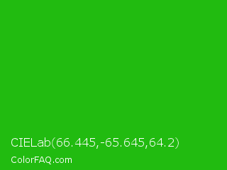 CIELab 66.445,-65.645,64.2 Color is a normal green color and the nearest color is Slimy Green #299617. Hex code #21bb10 and RGB value is rgb(33,187,16). In RGB color space, this color is composed of 13% red, 73% green, 6% blue, In CMYK color space, this color is composed of 82% cyan, 0% magenta, 91% yellow , 27% black , In HSL color space, this color has a hue angle of 114° , 84% saturation and 40% lightness.