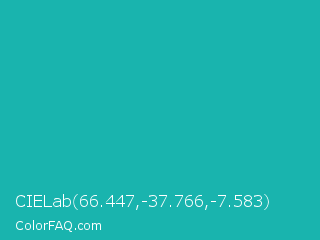 CIELab 66.447,-37.766,-7.583 Color is a normal cyan color and the nearest color is Light Sea Green #20b2aa. Hex code #19b4ae and RGB value is rgb(25,180,174). In RGB color space, this color is composed of 10% red, 71% green, 68% blue, In CMYK color space, this color is composed of 86% cyan, 0% magenta, 3% yellow , 29% black , In HSL color space, this color has a hue angle of 178° , 76% saturation and 40% lightness.
