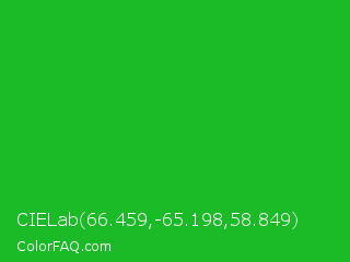 CIELab 66.459,-65.198,58.849 Color is a normal green color and the nearest color is Wageningen Green #34b233. Hex code #1bbb27 and RGB value is rgb(27,187,39). In RGB color space, this color is composed of 11% red, 73% green, 15% blue, In CMYK color space, this color is composed of 86% cyan, 0% magenta, 79% yellow , 27% black , In HSL color space, this color has a hue angle of 125° , 75% saturation and 42% lightness.