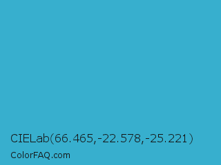CIELab 66.465,-22.578,-25.221 Color is a normal cyan color and the nearest color is Maximum Blue #47abcc. Hex code #37afce and RGB value is rgb(55,175,206). In RGB color space, this color is composed of 22% red, 69% green, 81% blue, In CMYK color space, this color is composed of 73% cyan, 15% magenta, 0% yellow , 19% black , In HSL color space, this color has a hue angle of 192° , 61% saturation and 51% lightness.