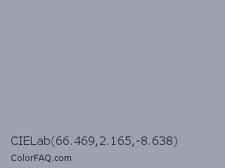 CIELab 66.469,2.165,-8.638 Color is a light blue color and the nearest color is Santas Gray #9fa0b1. Hex code #9ea1b1 and RGB value is rgb(158,161,177). In RGB color space, this color is composed of 62% red, 63% green, 69% blue, In CMYK color space, this color is composed of 11% cyan, 9% magenta, 0% yellow , 31% black , In HSL color space, this color has a hue angle of 231° , 11% saturation and 66% lightness.