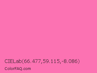 CIELab 66.477,59.115,-8.086 Color is a light rose color and the nearest color is Hot Pink #ff69b4. Hex code #fc72b2 and RGB value is rgb(252,114,178). In RGB color space, this color is composed of 99% red, 45% green, 70% blue, In CMYK color space, this color is composed of 0% cyan, 55% magenta, 29% yellow , 1% black , In HSL color space, this color has a hue angle of 332° , 96% saturation and 72% lightness.