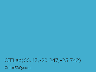 CIELab 66.47,-20.247,-25.742 Color is a normal blue color and the nearest color is Maximum Blue #47abcc. Hex code #42aecf and RGB value is rgb(66,174,207). In RGB color space, this color is composed of 26% red, 68% green, 81% blue, In CMYK color space, this color is composed of 68% cyan, 16% magenta, 0% yellow , 19% black , In HSL color space, this color has a hue angle of 194° , 59% saturation and 54% lightness.