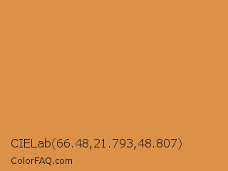 CIELab 66.48,21.793,48.807 Color is a normal orange color and the nearest color is Tigers Eye #e08d3c. Hex code #dc9149 and RGB value is rgb(220,145,73). In RGB color space, this color is composed of 86% red, 57% green, 29% blue, In CMYK color space, this color is composed of 0% cyan, 34% magenta, 67% yellow , 14% black , In HSL color space, this color has a hue angle of 29° , 68% saturation and 57% lightness.