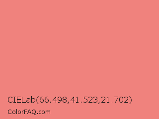 CIELab 66.498,41.523,21.702 Color is a light red color and the nearest color is Light Coral #f08080. Hex code #f0827d and RGB value is rgb(240,130,125). In RGB color space, this color is composed of 94% red, 51% green, 49% blue, In CMYK color space, this color is composed of 0% cyan, 46% magenta, 48% yellow , 6% black , In HSL color space, this color has a hue angle of 3° , 79% saturation and 72% lightness.