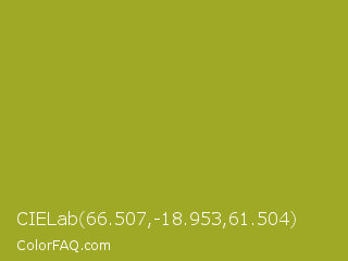 CIELab 66.507,-18.953,61.504 Color is a normal yellow color and the nearest color is Citron #9fa91f. Hex code #a0a925 and RGB value is rgb(160,169,37). In RGB color space, this color is composed of 63% red, 66% green, 15% blue, In CMYK color space, this color is composed of 5% cyan, 0% magenta, 78% yellow , 34% black , In HSL color space, this color has a hue angle of 64° , 64% saturation and 40% lightness.
