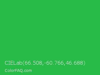 CIELab 66.508,-60.766,46.688 Color is a normal green color and the nearest color is Wageningen Green #34b233. Hex code #26ba47 and RGB value is rgb(38,186,71). In RGB color space, this color is composed of 15% red, 73% green, 28% blue, In CMYK color space, this color is composed of 80% cyan, 0% magenta, 62% yellow , 27% black , In HSL color space, this color has a hue angle of 133° , 66% saturation and 44% lightness.