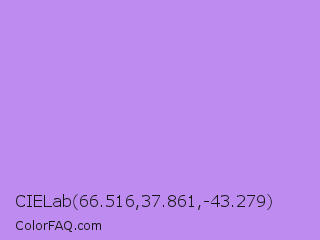 CIELab 66.516,37.861,-43.279 Color is a light violet color and the nearest color is Bright Lavender #bf94e4. Hex code #be8cf0 and RGB value is rgb(190,140,240). In RGB color space, this color is composed of 75% red, 55% green, 94% blue, In CMYK color space, this color is composed of 21% cyan, 42% magenta, 0% yellow , 6% black , In HSL color space, this color has a hue angle of 270° , 77% saturation and 75% lightness.