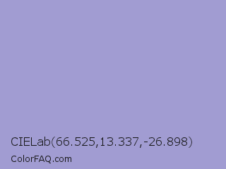 CIELab 66.525,13.337,-26.898 Color is a light indigo color and the nearest color is Blue Bell #a2a2d0. Hex code #a19cd2 and RGB value is rgb(161,156,210). In RGB color space, this color is composed of 63% red, 61% green, 82% blue, In CMYK color space, this color is composed of 23% cyan, 26% magenta, 0% yellow , 18% black , In HSL color space, this color has a hue angle of 246° , 38% saturation and 72% lightness.