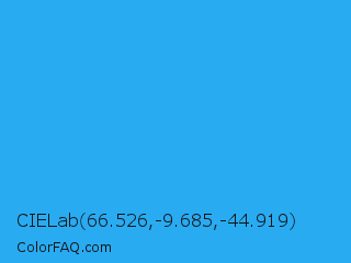 CIELab 66.526,-9.685,-44.919 Color is a normal blue color and the nearest color is Button Blue #24a0ed. Hex code #29abf2 and RGB value is rgb(41,171,242). In RGB color space, this color is composed of 16% red, 67% green, 95% blue, In CMYK color space, this color is composed of 83% cyan, 29% magenta, 0% yellow , 5% black , In HSL color space, this color has a hue angle of 201° , 89% saturation and 55% lightness.