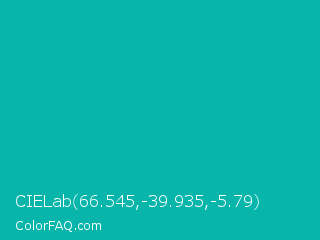 CIELab 66.545,-39.935,-5.79 Color is a normal cyan color and the nearest color is Tiffany Blue #0abab5. Hex code #07b5ab and RGB value is rgb(7,181,171). In RGB color space, this color is composed of 3% red, 71% green, 67% blue, In CMYK color space, this color is composed of 96% cyan, 0% magenta, 6% yellow , 29% black , In HSL color space, this color has a hue angle of 177° , 93% saturation and 37% lightness.