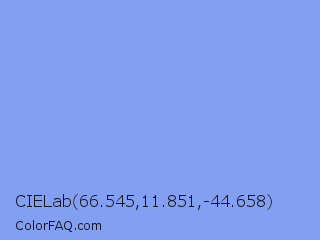 CIELab 66.545,11.851,-44.658 Color is a light blue color and the nearest color is Portage #8b9fee. Hex code #839ff2 and RGB value is rgb(131,159,242). In RGB color space, this color is composed of 51% red, 62% green, 95% blue, In CMYK color space, this color is composed of 46% cyan, 34% magenta, 0% yellow , 5% black , In HSL color space, this color has a hue angle of 225° , 81% saturation and 73% lightness.