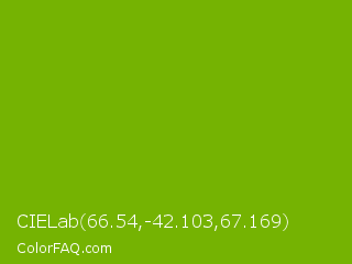 CIELab 66.54,-42.103,67.169 Color is a normal green color and the nearest color is Limeade #6f9d02. Hex code #75b302 and RGB value is rgb(117,179,2). In RGB color space, this color is composed of 46% red, 70% green, 1% blue, In CMYK color space, this color is composed of 35% cyan, 0% magenta, 99% yellow , 30% black , In HSL color space, this color has a hue angle of 81° , 98% saturation and 35% lightness.