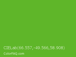 CIELab 66.557,-49.566,58.908 Color is a normal green color and the nearest color is Green RYB #66b032. Hex code #5fb629 and RGB value is rgb(95,182,41). In RGB color space, this color is composed of 37% red, 71% green, 16% blue, In CMYK color space, this color is composed of 48% cyan, 0% magenta, 77% yellow , 29% black , In HSL color space, this color has a hue angle of 97° , 63% saturation and 44% lightness.