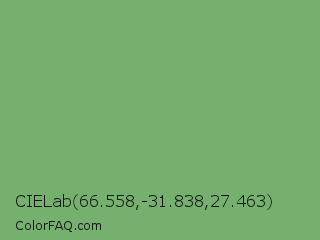 CIELab 66.558,-31.838,27.463 Color is a normal green color and the nearest color is Iguana Green #71bc78. Hex code #76b06f and RGB value is rgb(118,176,111). In RGB color space, this color is composed of 46% red, 69% green, 44% blue, In CMYK color space, this color is composed of 33% cyan, 0% magenta, 37% yellow , 31% black , In HSL color space, this color has a hue angle of 114° , 29% saturation and 56% lightness.