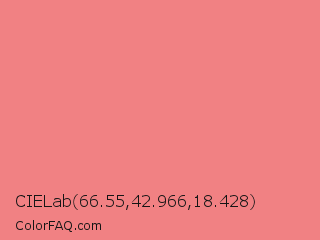CIELab 66.55,42.966,18.428 Color is a light red color and the nearest color is Light Coral #f08080. Hex code #f18183 and RGB value is rgb(241,129,131). In RGB color space, this color is composed of 95% red, 51% green, 51% blue, In CMYK color space, this color is composed of 0% cyan, 46% magenta, 46% yellow , 5% black , In HSL color space, this color has a hue angle of 359° , 80% saturation and 73% lightness.