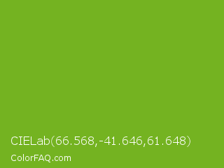 CIELab 66.568,-41.646,61.648 Color is a normal green color and the nearest color is Lima #76bd17. Hex code #74b321 and RGB value is rgb(116,179,33). In RGB color space, this color is composed of 45% red, 70% green, 13% blue, In CMYK color space, this color is composed of 35% cyan, 0% magenta, 82% yellow , 30% black , In HSL color space, this color has a hue angle of 86° , 69% saturation and 42% lightness.