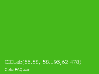 CIELab 66.58,-58.195,62.478 Color is a normal green color and the nearest color is Kelly Green #4cbb17. Hex code #46b91b and RGB value is rgb(70,185,27). In RGB color space, this color is composed of 27% red, 73% green, 11% blue, In CMYK color space, this color is composed of 62% cyan, 0% magenta, 85% yellow , 27% black , In HSL color space, this color has a hue angle of 104° , 75% saturation and 42% lightness.