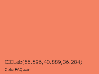 CIELab 66.596,40.889,36.284 Color is a light red color and the nearest color is Coral Reef Hipster Salmon #fd7c6e. Hex code #f48263 and RGB value is rgb(244,130,99). In RGB color space, this color is composed of 96% red, 51% green, 39% blue, In CMYK color space, this color is composed of 0% cyan, 47% magenta, 59% yellow , 4% black , In HSL color space, this color has a hue angle of 13° , 87% saturation and 67% lightness.