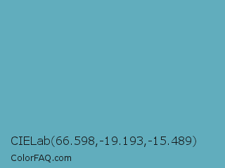 CIELab 66.598,-19.193,-15.489 Color is a normal cyan color and the nearest color is Fountain Blue #56b4be. Hex code #61adbd and RGB value is rgb(97,173,189). In RGB color space, this color is composed of 38% red, 68% green, 74% blue, In CMYK color space, this color is composed of 49% cyan, 8% magenta, 0% yellow , 26% black , In HSL color space, this color has a hue angle of 190° , 41% saturation and 56% lightness.