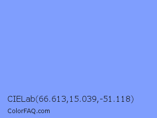 CIELab 66.613,15.039,-51.118 Color is a light blue color and the nearest color is Portage #8b9fee. Hex code #7f9efe and RGB value is rgb(127,158,254). In RGB color space, this color is composed of 50% red, 62% green, 100% blue, In CMYK color space, this color is composed of 50% cyan, 38% magenta, 0% yellow , 0% black , In HSL color space, this color has a hue angle of 225° , 98% saturation and 75% lightness.