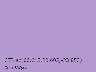 CIELab 66.615,20.695,-23.852 Color is a light purple color and the nearest color is East Side #ac91ce. Hex code #b397cd and RGB value is rgb(179,151,205). In RGB color space, this color is composed of 70% red, 59% green, 80% blue, In CMYK color space, this color is composed of 13% cyan, 26% magenta, 0% yellow , 20% black , In HSL color space, this color has a hue angle of 271° , 35% saturation and 70% lightness.