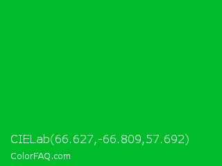 CIELab 66.627,-66.809,57.692 Color is a normal green color and the nearest color is Dark Pastel Green #03c03c. Hex code #00bc2b and RGB value is rgb(0,188,43). In RGB color space, this color is composed of 0% red, 74% green, 17% blue, In CMYK color space, this color is composed of 100% cyan, 0% magenta, 77% yellow , 26% black , In HSL color space, this color has a hue angle of 134° , 100% saturation and 37% lightness.