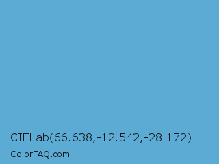 CIELab 66.638,-12.542,-28.172 Color is a normal blue color and the nearest color is Carolina Blue #56a0d3. Hex code #5cabd4 and RGB value is rgb(92,171,212). In RGB color space, this color is composed of 36% red, 67% green, 83% blue, In CMYK color space, this color is composed of 57% cyan, 19% magenta, 0% yellow , 17% black , In HSL color space, this color has a hue angle of 201° , 58% saturation and 60% lightness.