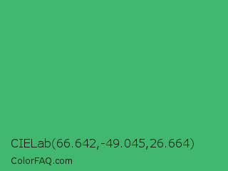 CIELab 66.642,-49.045,26.664 Color is a normal green color and the nearest color is Medium Sea Green #3cb371. Hex code #41b770 and RGB value is rgb(65,183,112). In RGB color space, this color is composed of 25% red, 72% green, 44% blue, In CMYK color space, this color is composed of 64% cyan, 0% magenta, 39% yellow , 28% black , In HSL color space, this color has a hue angle of 144° , 48% saturation and 49% lightness.