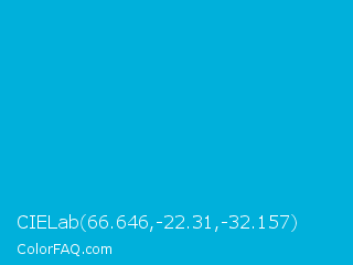 CIELab 66.646,-22.31,-32.157 Color is a normal cyan color and the nearest color is Cerulean #02a4d3. Hex code #00b0db and RGB value is rgb(0,176,219). In RGB color space, this color is composed of 0% red, 69% green, 86% blue, In CMYK color space, this color is composed of 100% cyan, 20% magenta, 0% yellow , 14% black , In HSL color space, this color has a hue angle of 192° , 100% saturation and 43% lightness.