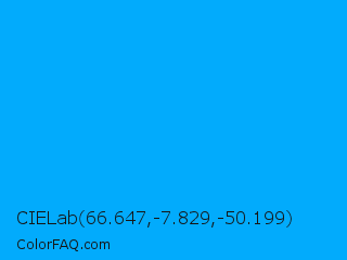 CIELab 66.647,-7.829,-50.199 Color is a normal blue color and the nearest color is Vivid Cerulean #00aaee. Hex code #02abfc and RGB value is rgb(2,171,252). In RGB color space, this color is composed of 1% red, 67% green, 99% blue, In CMYK color space, this color is composed of 99% cyan, 32% magenta, 0% yellow , 1% black , In HSL color space, this color has a hue angle of 199° , 98% saturation and 50% lightness.