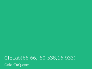 CIELab 66.66,-50.538,16.933 Color is a normal green color and the nearest color is Mountain Meadow Crayola #1ab385. Hex code #1fb882 and RGB value is rgb(31,184,130). In RGB color space, this color is composed of 12% red, 72% green, 51% blue, In CMYK color space, this color is composed of 83% cyan, 0% magenta, 29% yellow , 28% black , In HSL color space, this color has a hue angle of 159° , 71% saturation and 42% lightness.