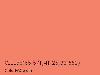 CIELab 66.671,41.25,33.662 Color is a light red color and the nearest color is Salmon #fa8072. Hex code #f48268 and RGB value is rgb(244,130,104). In RGB color space, this color is composed of 96% red, 51% green, 41% blue, In CMYK color space, this color is composed of 0% cyan, 47% magenta, 57% yellow , 4% black , In HSL color space, this color has a hue angle of 11° , 86% saturation and 68% lightness.