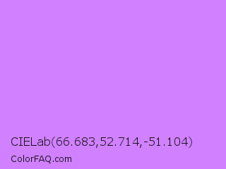 CIELab 66.683,52.714,-51.104 Color is a light purple color and the nearest color is Heliotrope #df73ff. Hex code #d180ff and RGB value is rgb(209,128,255). In RGB color space, this color is composed of 82% red, 50% green, 100% blue, In CMYK color space, this color is composed of 18% cyan, 50% magenta, 0% yellow , 0% black , In HSL color space, this color has a hue angle of 278° , 100% saturation and 75% lightness.