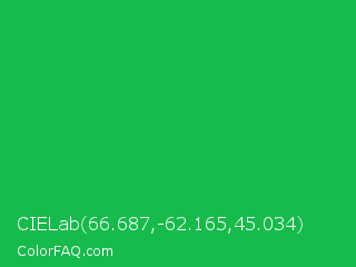 CIELab 66.687,-62.165,45.034 Color is a normal green color and the nearest color is Dark Pastel Green #03c03c. Hex code #16bb4b and RGB value is rgb(22,187,75). In RGB color space, this color is composed of 9% red, 73% green, 29% blue, In CMYK color space, this color is composed of 88% cyan, 0% magenta, 60% yellow , 27% black , In HSL color space, this color has a hue angle of 139° , 79% saturation and 41% lightness.