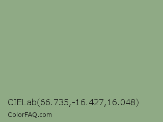 CIELab 66.735,-16.427,16.048 Color is a normal green color and the nearest color is Envy #8ba690. Hex code #8faa85 and RGB value is rgb(143,170,133). In RGB color space, this color is composed of 56% red, 67% green, 52% blue, In CMYK color space, this color is composed of 16% cyan, 0% magenta, 22% yellow , 33% black , In HSL color space, this color has a hue angle of 104° , 18% saturation and 59% lightness.