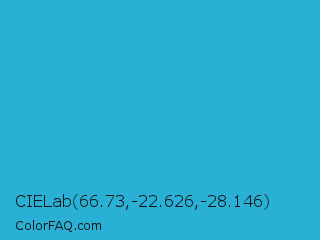 CIELab 66.73,-22.626,-28.146 Color is a normal cyan color and the nearest color is Ball Blue #21abcd. Hex code #29b0d4 and RGB value is rgb(41,176,212). In RGB color space, this color is composed of 16% red, 69% green, 83% blue, In CMYK color space, this color is composed of 81% cyan, 17% magenta, 0% yellow , 17% black , In HSL color space, this color has a hue angle of 193° , 68% saturation and 50% lightness.
