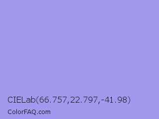 CIELab 66.757,22.797,-41.98 Color is a light indigo color and the nearest color is Dull Lavender #a899e6. Hex code #a298ee and RGB value is rgb(162,152,238). In RGB color space, this color is composed of 64% red, 60% green, 93% blue, In CMYK color space, this color is composed of 32% cyan, 36% magenta, 0% yellow , 7% black , In HSL color space, this color has a hue angle of 247° , 72% saturation and 76% lightness.