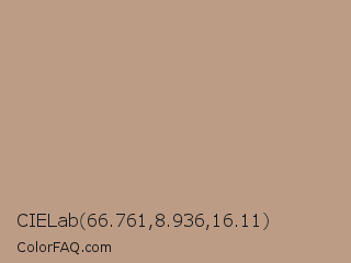 CIELab 66.761,8.936,16.11 Color is a light orange color and the nearest color is Pale Taupe #bc987e. Hex code #bd9c86 and RGB value is rgb(189,156,134). In RGB color space, this color is composed of 74% red, 61% green, 53% blue, In CMYK color space, this color is composed of 0% cyan, 17% magenta, 29% yellow , 26% black , In HSL color space, this color has a hue angle of 24° , 29% saturation and 63% lightness.