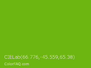 CIELab 66.776,-45.559,65.38 Color is a normal green color and the nearest color is Lima #76bd17. Hex code #6db510 and RGB value is rgb(109,181,16). In RGB color space, this color is composed of 43% red, 71% green, 6% blue, In CMYK color space, this color is composed of 40% cyan, 0% magenta, 91% yellow , 29% black , In HSL color space, this color has a hue angle of 86° , 84% saturation and 39% lightness.