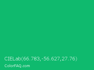 CIELab 66.783,-56.627,27.76 Color is a normal green color and the nearest color is Green Crayola #1cac78. Hex code #0fba6e and RGB value is rgb(15,186,110). In RGB color space, this color is composed of 6% red, 73% green, 43% blue, In CMYK color space, this color is composed of 92% cyan, 0% magenta, 41% yellow , 27% black , In HSL color space, this color has a hue angle of 153° , 85% saturation and 39% lightness.