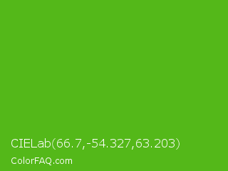 CIELab 66.7,-54.327,63.203 Color is a normal green color and the nearest color is Kelly Green #4cbb17. Hex code #54b819 and RGB value is rgb(84,184,25). In RGB color space, this color is composed of 33% red, 72% green, 10% blue, In CMYK color space, this color is composed of 54% cyan, 0% magenta, 86% yellow , 28% black , In HSL color space, this color has a hue angle of 98° , 76% saturation and 41% lightness.