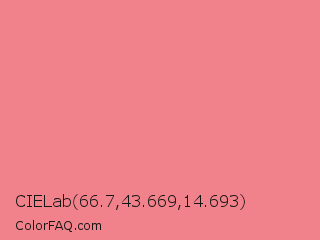 CIELab 66.7,43.669,14.693 Color is a light red color and the nearest color is Light Coral #f08080. Hex code #f1818a and RGB value is rgb(241,129,138). In RGB color space, this color is composed of 95% red, 51% green, 54% blue, In CMYK color space, this color is composed of 0% cyan, 46% magenta, 43% yellow , 5% black , In HSL color space, this color has a hue angle of 355° , 80% saturation and 73% lightness.