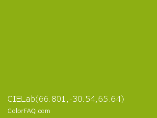 CIELab 66.801,-30.54,65.64 Color is a normal lime color and the nearest color is Apple Green #8db600. Hex code #8daf13 and RGB value is rgb(141,175,19). In RGB color space, this color is composed of 55% red, 69% green, 7% blue, In CMYK color space, this color is composed of 19% cyan, 0% magenta, 89% yellow , 31% black , In HSL color space, this color has a hue angle of 73° , 80% saturation and 38% lightness.